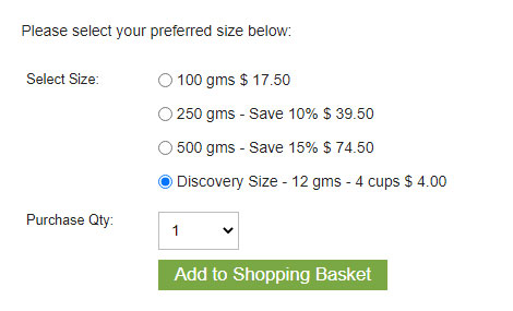 ** Some speciality flavours are offered in smaller standard quantites than these sizes.  This includes our White Tea range, Jasmine Pearl, Butterfly Pea and Peppy Mint.  The size will be clearly noted when you are browsing our products.