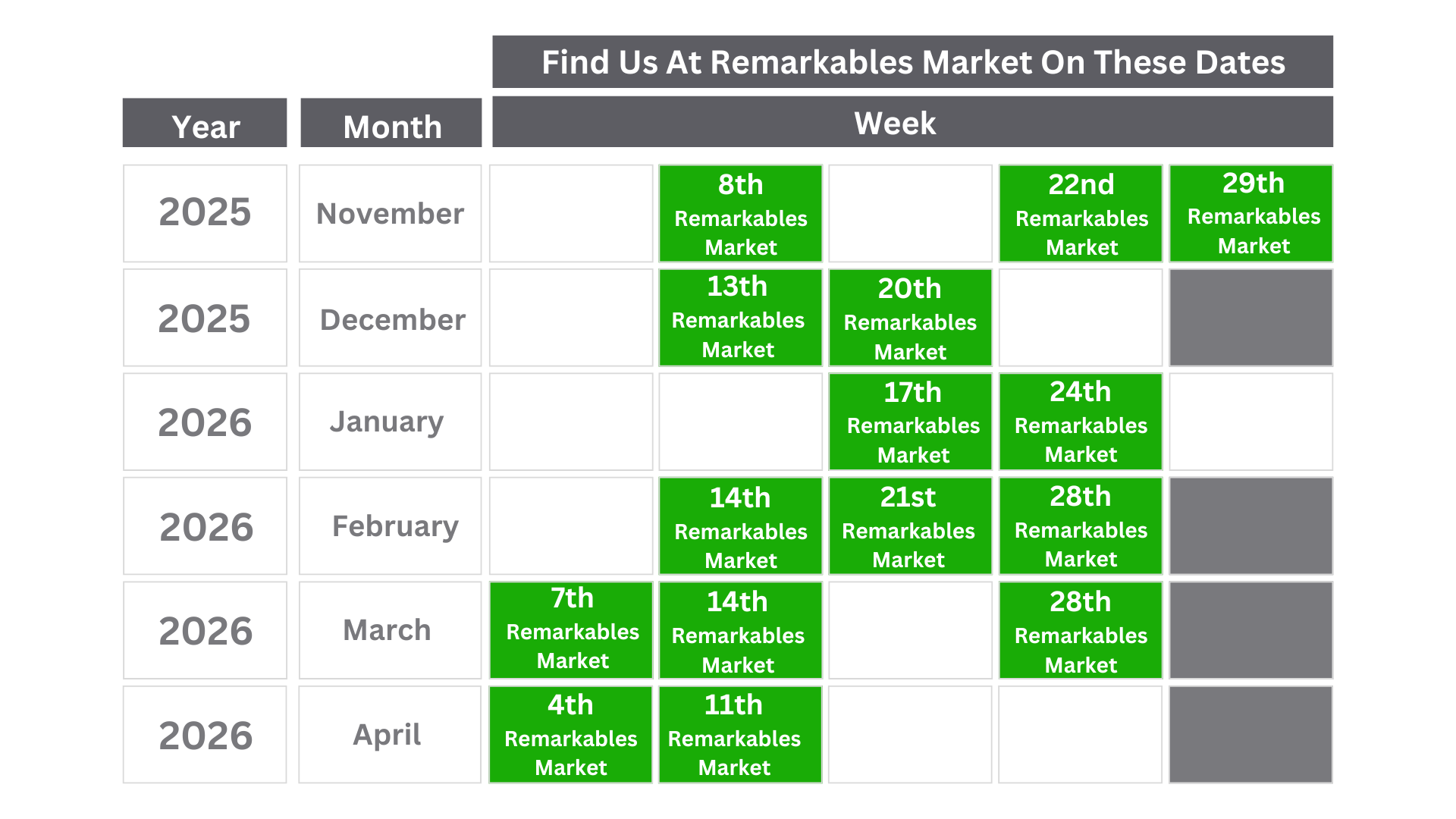Find us at the Saturday, Remarkables Market on these dates: