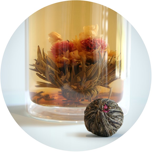 Green tea leaves are skilfully and elegantly hand tied around dried flowers which bloom when steeped in near boiling water.