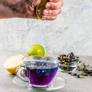 Add a squeeze of fresh lemon juice to change the acidity of the liquor and watch the magical display as the vivid blue transforms colour